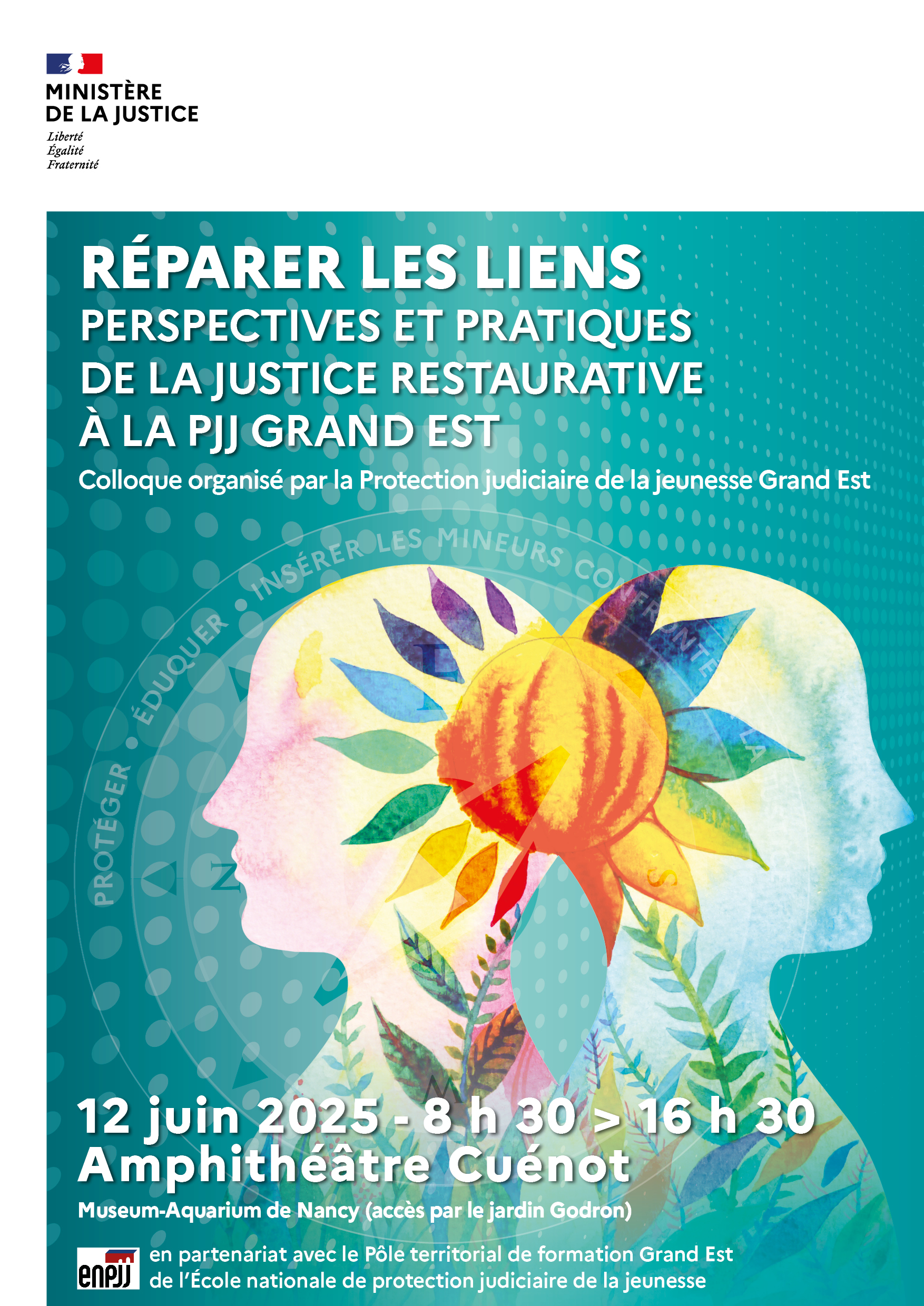 Le jeudi 12 juin 2025, la direction interrégionale Grand-Est de la Protection judiciaire de la jeunesse (DIR GE PJJ) organise en partenariat avec le pôle territorial de formation Grand-Est (PTF GE) de l’École nationale de protection judiciaire de la jeunesse (ENPJJ) un colloque intitulé « Réparer les liens : perspectives et pratiques de la justice restaurative à la PJJ Grand-Est ». À destination des professionnels de la protection judiciaire de la jeunesse et plus largement de la protection de l’enfance, il se tiendra dans l’amphithéâtre Cuénot du musée-aquarium de Nancy.