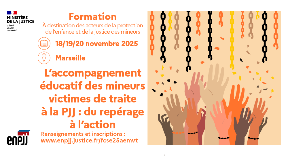 Du mardi 18 au jeudi 20 novembre 2025, le pôle territorial de formation (PTF) Sud-Est de l’École nationale de protection judiciaire de la jeunesse (ENPJJ) organise une formation sur l’accompagnement éducatif des mineurs victimes de traite à la protection judiciaire de la jeunesse (PJJ). Cette formation, qui se tiendra au PTF (7, impasse Sylvestre, Marseille), s’adresse aux acteurs de la protection de l’enfance et de la justice des mineurs.