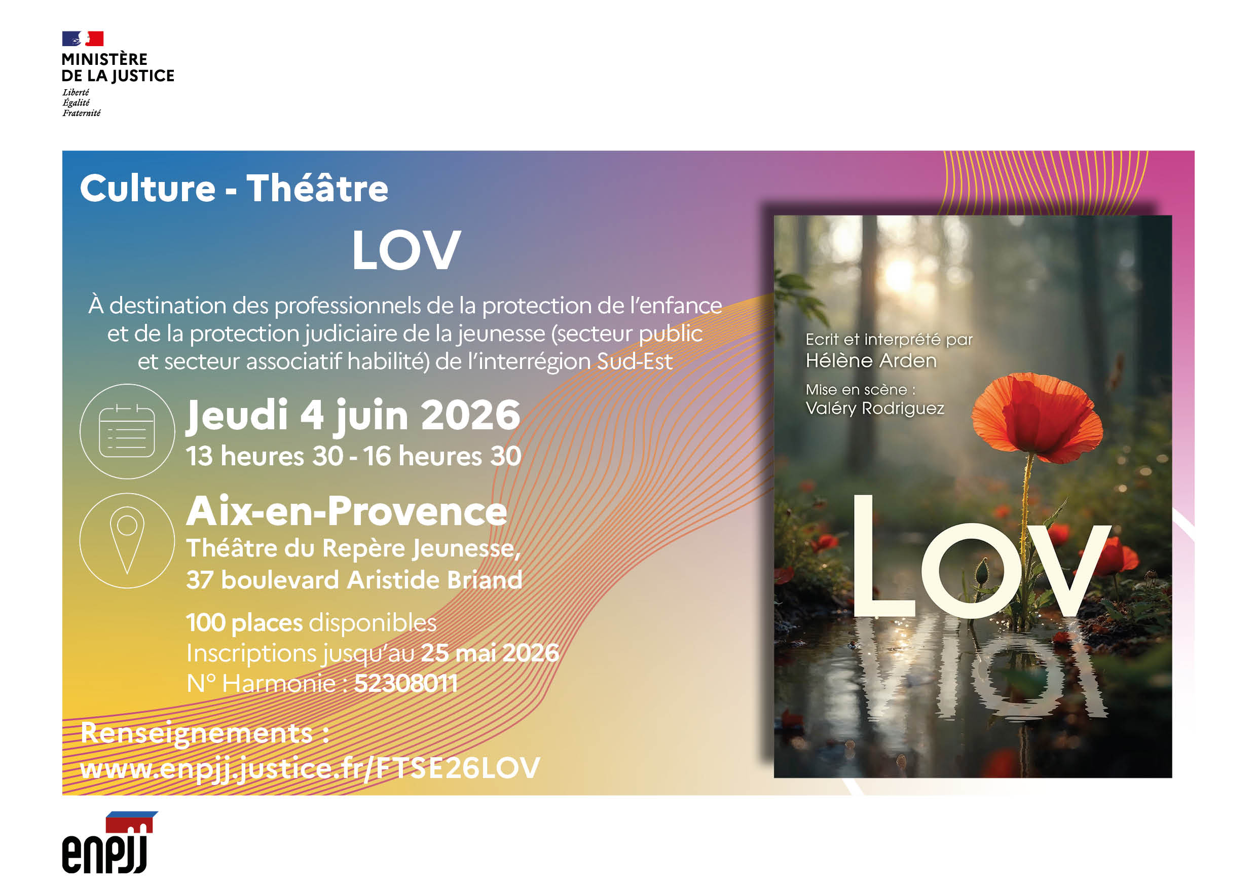 Le pôle territorial de formation Sud-Est (Marseille - Bouches-du-Rhône) de l'École nationale de protection judiciaire de la jeunesse (ENPJJ) organise une représentation de la pièce de théâtre intitulée « LOV », sur la thématique des violence sexuelles. À destination des professionnels de la protection de l’enfance et de la protection judiciaire de la jeunesse (secteur public et secteur associatif habilité) de l’interrégion Sud-Est, elle se tiendra le jeudi 4 juin 2026 de 13 heures 30 à 16 heures 30 au théâtre du Repère Jeunesse (37, boulevard Aristide Briand) à Aix-en-Provence et sera suivie d'un temps d'échanges avec la comédienne. Les inscriptions sont ouvertes jusqu’au 25 mai 2026.