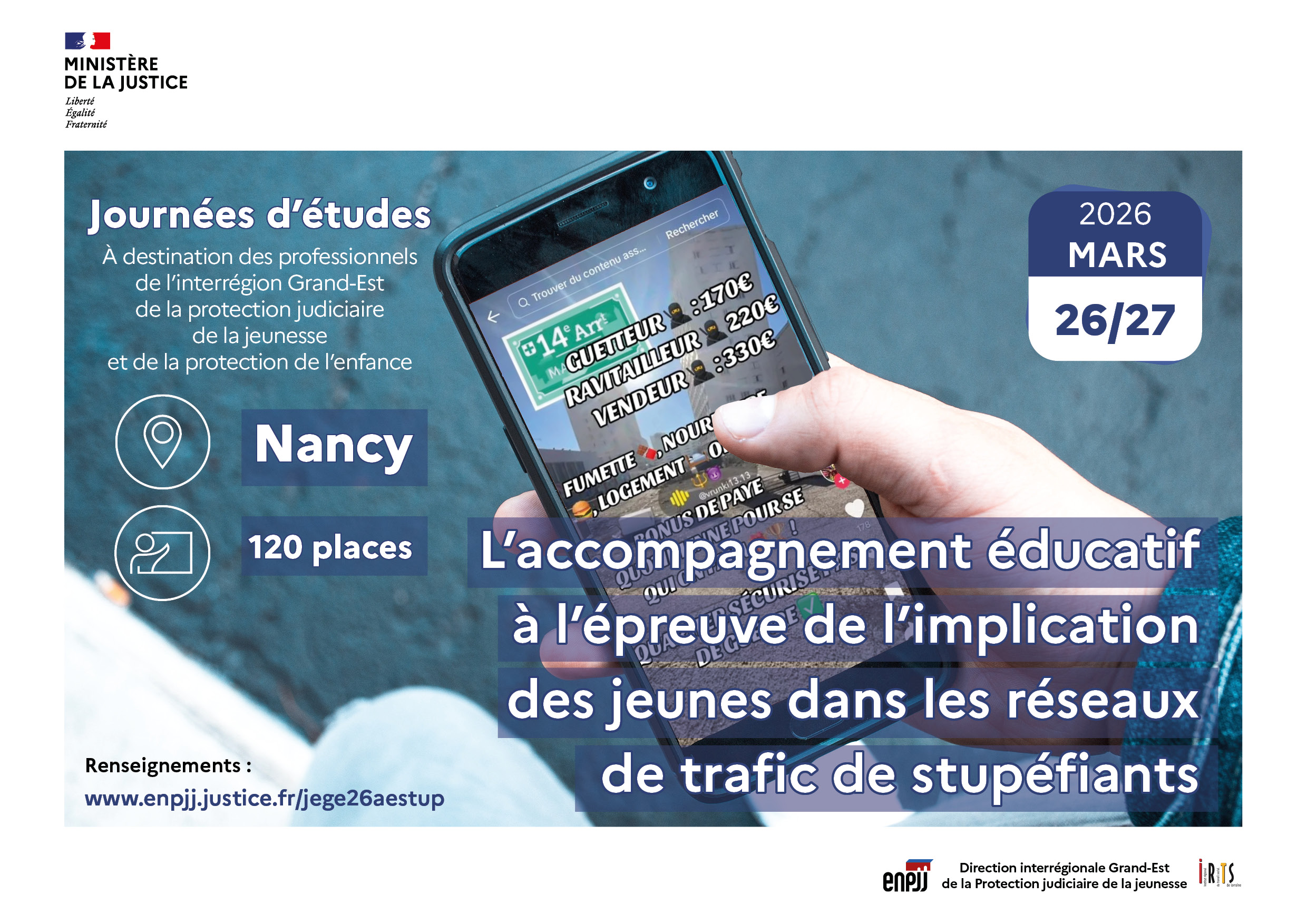 Les jeudi 26 et vendredi 27 mars 2026, le pôle territorial de formation Grand-Est (Nancy) de l’École nationale de protection judiciaire de la jeunesse (ENPJJ) organise, en collaboration avec la Direction interrégionale Grand-Est de la protection judiciaire de la jeunesse et l’Institut régional de travail social (IRTS) de Lorraine, des journées d'études sur l’accompagnement éducatif à l’épreuve de l’implication des jeunes dans les réseaux de trafic de stupéfiants, à destination des professionnels de la protection judiciaire de la jeunesse et de la protection de l’enfance de l’interrégion Grand-Est. Les inscriptions sont ouvertes jusqu’au vendredi 13 mars 2026.