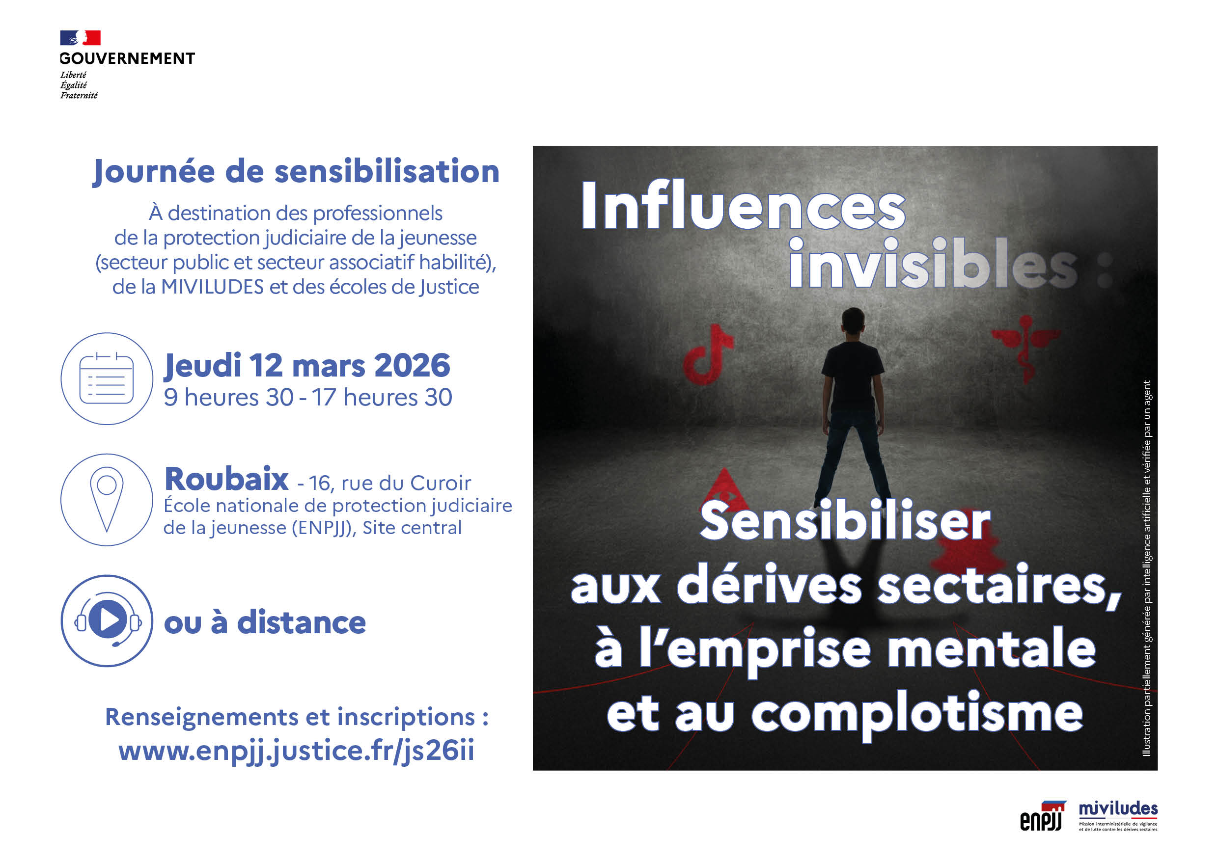Le jeudi 12 mars 2026, l’École nationale de protection judiciaire de la jeunesse (ENPJJ) et la Mission interministérielle de vigilance et de lutte contre les dérives sectaires (Miviludes) organisent une journée de sensibilisation à destination des professionnels des secteurs public et associatif habilité de la Protection judiciaire de la jeunesse, des écoles du ministère de la Justice et de la Miviludes. Intitulée « Influences invisibles : sensibiliser aux dérives sectaires, à l’emprise mentale et au complotisme », elle pourra être suivie en présentiel au site central de l’ENPJJ (16, rue du Curoir, Roubaix) ou à distance. Les inscriptions sont ouvertes jusqu’au 6 mars 2026.
